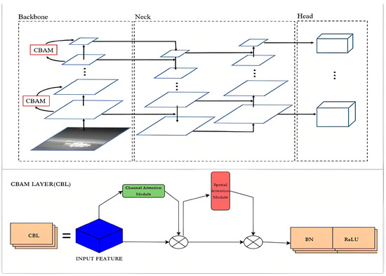 As shown in Figure 4, to achieve channel attention and spatial attention, CONV is combined with the CBL module. The channel attention module and the spatial attention module take the role of the original CONV [42], enabling the network to reinforce important information while reducing the interference from irrelevant information [40].