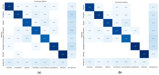 The confusion matrix is a method for summarizing a classification algorithm’s performance. The diagonal line shows the significance of the prediction outcomes in the confusion matrix; the horizontal and vertical lines represent false negatives and false positives, respectively. Figure 9 illustrates the confusion matrix of five YOLO models used in the experimental study conducted on seven classes of insects.