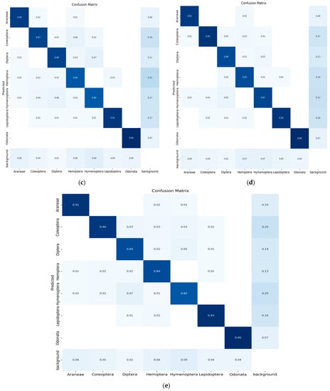 (a) Confusion matrix (YOLO-v5s), (b) confusion matrix (YOLO-v5m), (c) confusion matrix (YOLO-v5l), (d) confusion matrix (YOLO-v5x) and (e) confusion matrix (modified YOLO-v5x).
