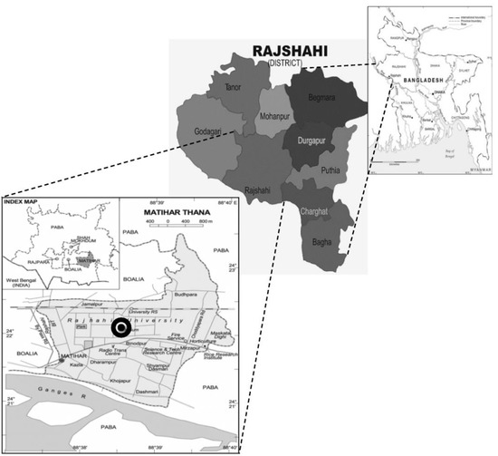 The study site is located in Motihar sub-district (between 24° 21′ 48.59″ N and 88° 37′ 40.96″ E) of Rajshahi City, Bangladesh. The climate of Rajshahi is typically characterized by monsoons (precipitations 1221.0 mm/year), high temperatures (Avg. 30 °C), and high humidity. The annual temperature is 28.49 °C, which is 0.75% greater than Bangladesh’s averages. It is situated 20 m above sea level. Two experiments were conducted for a period of four months from August to November 2015 in six experimental rice fields (Figure 1) of the Department of Agronomy and Agricultural Extension, University of Rajshahi. Rice fields were rectangular in shape and all were rainfed. The average area of the rice fields was 0.024 ha (5.92 decimal) (Figure 2). Each experiment had three different treatments with two replicates. Component selections were done on the basis of national priority and market availability throughout the counter as well. The present study had used 2 rice varieties (BRRI 51, BRRI 52), 3 fish species (Cyprinus carpio var. communis, Barbonymus gonionotus and Oreochromis niloticus) and 2 combinations of vegetables i.e., (a) Red amaranth (Amaranthus cruentus) and Indian spinach (Spinacia oleracea), (b) Cucumber (Cucumis sativus) and Water spinach (Ipomoea aquatica) to find out suitable rice, fish and vegetables combination to recommend for the integrated farming system. The experimental combinations were running by permutation complexes of sample numbers in different layouts. The treatments of each experiment were assigned as follows: