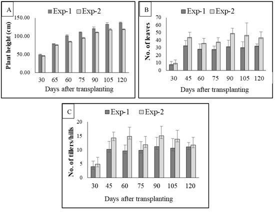 Rice growth parameters as characterized by (A). plant height, (B). no. of leaves and (C). no. of tillers/ hills in experiment-1 and 2 of a rice–fish–vegetable culture system. Values are means ± SD.