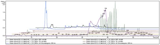 The total ion chromatogram of tandem mass spectrometry of the S. tuberosum L. (variety Hybrid 15/F-2-13) sample is represented on Figure 1. Purple line—base peek chromatogram of positive ion signal intensity; red line—base peek chromatogram of negative ion signal intensity; light green line—total intensity of positive ions; brown line—total intensity of negative ions; blue line—UV chromatogram (wavelength 230 ηm); black line—UV chromatogram (wavelength 330 ηm). The obtained mass spectrometric data make it possible to compile a detailed table of the presence of identified compounds in different varieties of the Siberian S. tuberosum, which further makes it possible to construct comparative Venn diagrams. (Appendix A Table A2).