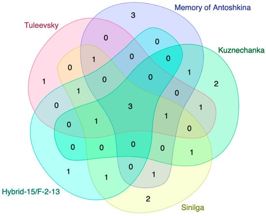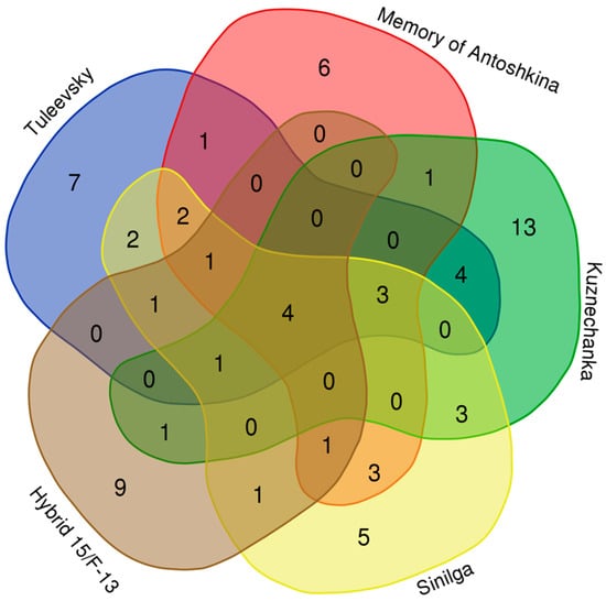 Venn diagram comparing the composition of isolated bioactive components in potato samples “Tuleevsky”, “Memory of Antoshkina”, “Kuznechanka’’, “Sinilga”, “Hybrid 15/F-2-13”.