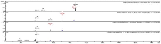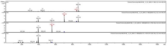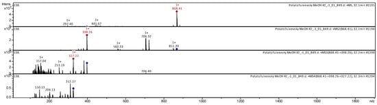 Figure 4 shows an example of decoding the spectrum of the steroidal alkaloid α-solanine from an ion chromatogram obtained by tandem mass spectrometry. The [M + H]+ ion produces four product ions at m/z 398.26, m/z 560.33, m/z 706.32, and at m/z 851.39 (Figure 4). A fragment ion at m/z 398.26 gives rise to three daughter ions at m/z 327.22, m/z 253.19, and m/z 157.04. A fragment ion at m/z 327.22 gives rise to three daughter ions at m/z 312.27, m/z 204.13, and m/z 150.13. This compound is identified in scientific articles as α-solanine, for example in S. tuberosum [,,,].