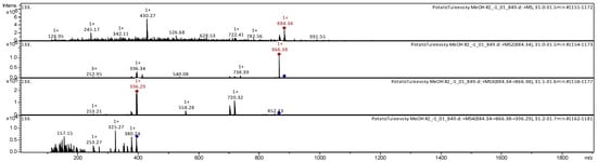 In the mass spectra [M + H]+ ions at m/z 868 and 884 were observed. Four additional peaks of triglycosides described by us, as glycosidic conjugates of dehydrosolanidine were also identified, their protonated molecular ions [M + H]+ were detected at m/z 850 and m/z 866, respectively (Figure 5, Figure 6 and Figure 7).