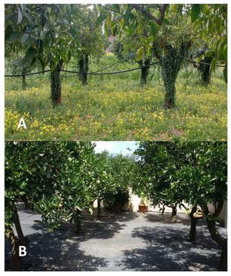This study was carried out in a peri-urban area (Sicily, Italy; 37°42′22.60″ N; 12°30′20.32″ E) where citrus orchards are generally cultivated near the inhabited center. Washington navel orange plants were planted in 1982 with a layout of 5 × 5 m, thus having 400 plants per hectare (Figure 1).