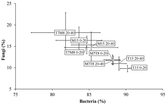 Relationships between relative abundance of total bacteria and fungi at both soil depths of the four soil management systems: M0T15, rotary tillage; T0M15, mulching with black plastic geotextiles during the last 15 years; T7M8, tillage for 7 years followed by mulching during the last 8 years; M7T8, mulching for 7 years followed by tillage during the last 8 years.