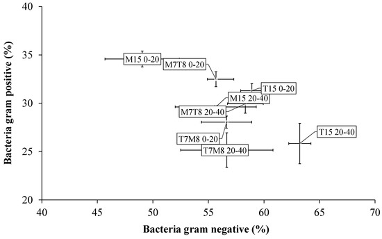 In the topsoil, similarly to previous bioindicators, they were more abundant in soil only mulched for 15 years, followed by that mulched for the last 8 years, whereas the lowest value was found in soil only tilled for 15 years. The same pattern was found in the subsoil, except for no difference between M7T8 and T7M8. Additionally, fungi for any treatment were more abundant in the topsoil compared to the subsoil (Table 2). At both depths, soil only mulched for 15 years exhibited values of fungi at least triple compared to the soil only tilled for 15 years, with the other two treatments (M7T8 and T7M8) exhibiting intermediate values. However, at both depths no difference was found between these two treatments (Table 2). Within bacteria, the bac+ predominated over bac- and displayed the same pattern among treatments: both groups were more abundant in soil only mulched for 15 years and the lowest in the only tilled one (Table 2). However, by increasing the time during which the soils are tilled at both depths, the fungi decreased and the bacteria increased, whereas the opposite, evidently, occurred by increasing the time during which the soils are mulched (fungi increased and bacteria decreased) (Figure 2). Additionally, bac- and bac+ displayed a pattern linked to soil management: by increasing the time during which the soils are tilled, bac- increased, whereas bac+ decreased. On the other hand, as expected, by increasing the time during which the soils area is mulched, bac+ decreased and bac- increased (Figure 3).