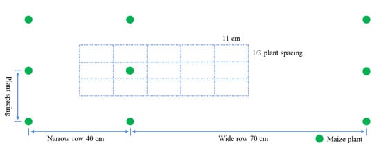The two sowing dates were 20 April 2019, and 17 April 2021. The two sampling dates were 17 July, 1 October 2019, and 16 July, 26 September 2021, and the two harvest dates were 3 October 2019, and 28 September 2021. Growing degree days (GDDs) of DH618 and SC704 were 1501.7 °C and 1533.6 °C in the two experiment years. Drip water irrigation (15 mm) was applied in the 24 h after sowing to ensure uniform seedling emergence. After emergence, seedlings were not irrigated until the jointing stage to promote root growth. After the jointing stage, drip irrigation technology was used to conduct integrated quantitative water every 9–10 days. The total amount of water applied was approximately 540 mm per growing season. The physical and chemical properties of the soil at the test site were assessed at a depth of 0–60 cm (Table 1). To ensure soil basic fertility, consistent with the target yield, 150 kg ha−1 N fertilizer (urea), 225 kg ha−1 P fertilizer (super phosphate), and 75 kg ha−1 K fertilizer (potassium sulfate) were applied as base fertilizer, and a total of 300 kg ha−1 N fertilizer (urea) was applied as topdressing fertilizer during the growing season. Meteorological data were captured at meteorological observation points near the test site during the 2019 and 2021 maize growing seasons (Table 2). During this period, good management measures were maintained in the field. Sufficient water and nutrients were provided throughout the growth period to avoid water or nutrient deprivation stress, and diseases, insects, and weeds were well-controlled.