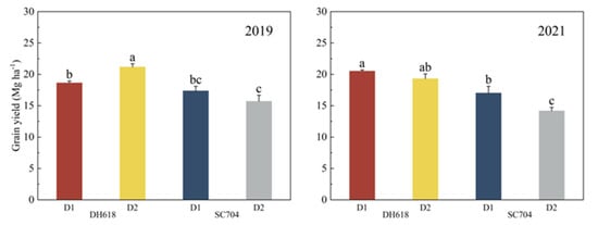 On average over the two growth seasons, DH618 had a higher grain yield under D2 than D1 conditions; this was significantly higher than the yield of SC704 at either planting density. The average grain yields of DH618 were 19.57 Mg ha−1 and 20.24 Mg ha−1 under D1 and D2 density, and the SC704 were 17.19 Mg ha−1 and 14.94 Mg ha−1, respectively. For D1 and D2 conditions, there were significant yield differences for DH618 in 2019 and for SC704 in 2021, but no significant differences for SC704 in 2019 or for DH618 in 2021 (Figure 2).