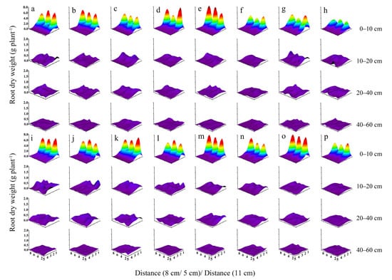 Vertical distribution of root dry weight (RDW) of two maize cultivars (DH618 and SC704) grown at two planting densities (D1 and D2). (a–d) RDW at the silking stage in 2019 for (a) DH618 grown at D1, (b) DH618 grown at D2, (c) SC704 grown at D1, and (d) SC704 grown at D2. (e–h) RDW at maturity in 2019 for (e) DH618 grown at D1, (f) DH618 grown at D2, (g) SC704 grown at D1, and (h) SC704 grown at D2. (i–l) RDW at the silking stage in 2021 for (i) DH618 grown at D1, (j) DH618 grown at D2, (k) SC704 grown at D1, and (l) SC704 grown at D2. (m–p) RDW at maturity in 2021 for (m) DH618 grown at D1, (n) DH618 grown at D2, (o) SC704 grown at D1, and (p) SC704 grown at D2.