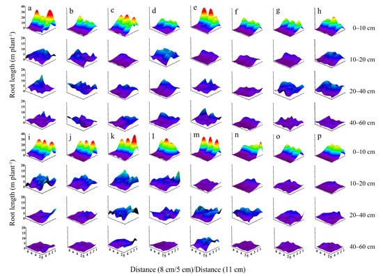 Vertical distribution of root length (RL) for two maize cultivars (DH618 and SC704) grown at two planting densities (D1 and D2). (a–d) RL at the silking stage in 2019 for (a) DH618 grown at D1, (b) DH618 grown at D2, (c) SC704 grown at D1, and (d) SC704 grown at D2. (e–h) RL at maturity in 2019 for (e) DH618 grown at D1, (f) DH618 grown at D2, (g) SC704 grown at D1, and (h) SC704 grown at D2. (i–l) RL at the silking stage in 2021 for (i) DH618 grown at D1, (j) DH618 grown at D2, (k) SC704 grown at D1, and (l) SC704 grown at D2. (m–p) RL at maturity in 2021 for (m) DH618 grown at D1, (n) DH618 grown at D2, (o) SC704 grown at D1, and (p) SC704 grown at D2.