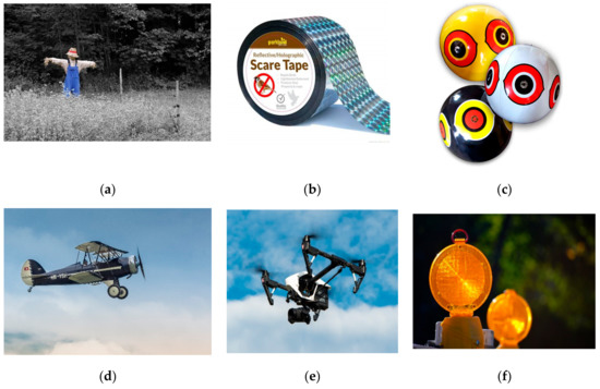 Visual deterrents: (a) scarecrows; (b) reflecting tape; (c) hawk balloons; (d) aircraft; (e) RC aircraft; (f) lights.