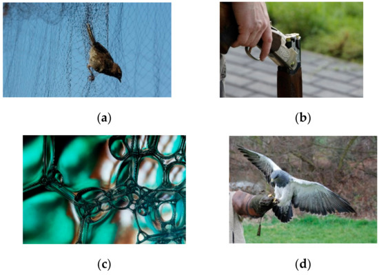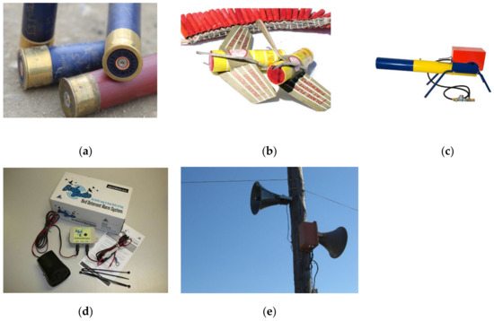 Weapons such as shotguns, shown in Figure 2a, when fired with real ammunition, produce a loud noise that can scatter the birds. Moreover, the shot fired can also hit the bird and kill it at fisheries operations [47,48,49,50], in agricultural fields [18], and at airports [15,34]. Even though birds can be driven away, they get used to the sound of the shots. So, it works only temporarily, and there are records of birds that returned to the site shortly after being dispersed by such noises [51,52].
