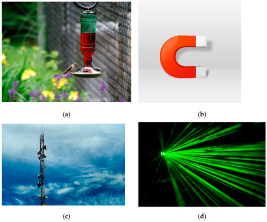 Flashing, rotating lights, and spotlights, shown in Figure 1f, can be used to scare birds away [37]. The reason why lights scare birds away is not truly clear. It is thought that it is because birds have not yet learned them. Thus, they are a novelty that causes them anxiety, and they prefer to fly away. At night, it is believed that lights dazzle and disorientate the birds. Lights are also used to warn birds of dangers, such as those implemented in aircraft.