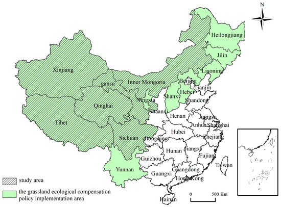 Distribution of grassland ecological compensation policy implementation provinces. The data comes from the official website of the Central People’s Government of the People’s Republic of China (http://www.gov.cn/zhengce/zhengceku/2022-05/13/content_5690136.htm (accessed on 15 January 2023).