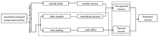 Payments for ecosystem services (PES) have received a lot of attention as an incentive-oriented environmental policy tool, especially in the intersection of poverty and ecological fragility [1,2]. PES aims at internalizing market externalities by providing compensation to the providers of ecosystem services (ES) and has gained legitimacy in developing countries due to promoting ecosystem conservation and income increase in a “win-win” manner [3,4]. In recent years, the continuous warming of the global climate has not only had a huge impact on the yield of traditional crops, but also had a huge impact on the growth of grassland, which once threatened national food security [5,6,7]. To protect grassland ecology and promote herdsmen’s income, the Chinese government initiated a large-scale ecological compensation program, the Grassland Ecological Compensation Policy (GECP), in 2011. However, for government-financed ecological compensation programs, the buyers are not the direct users but a third party acting on behalf of the environment service users [8]. Affected by a variety of political, social, and other pressures, the tradeoff between PES’s multiple goals makes people doubt PES’s ability to achieve an income increase [9,10]. Therefore, it is important to correctly examine the relationship between PES and income and to clarify the internal mechanisms between them. This not only helps to consolidate and improve the grassland ecological compensation policy, but also has important practical significance for the realization of the dual goals of grassland ecology and herdsmen’s income. At the same time, it provides corresponding research methods and theoretical references for the research on the effects of other ecological compensation policies in the future.