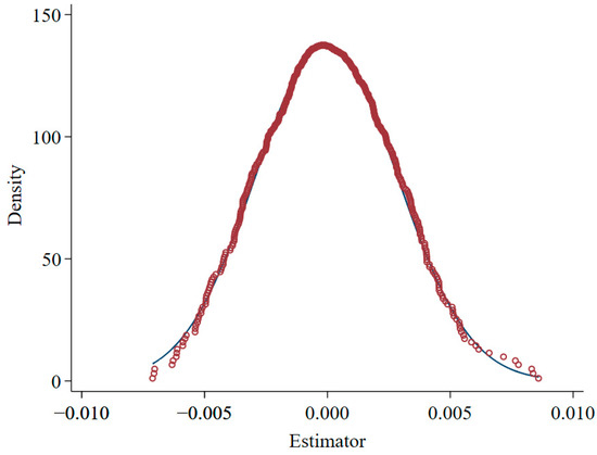 Given the possibility of unobservable factors other than GECP influencing income, which could lead to biased estimation results. In this paper, a placebo test and a double difference to construct a virtual environment with a quasi-natural experiment are used to test for possible risks. Specifically, a random sampling method was used to generate a random experimental group for the annual GECP, which in turn generated estimates of the coefficients of the wrong multiplicative difference term. A total of 1000 random samples were conducted in this paper, and the samples from each sample were included in a double-difference benchmark regression model for estimation. If the constructed independent variables do not have a significant effect on herdsmen’s income, then the baseline regression results can be said to be more robust. Figure 4 shows the distribution of the t-values of the regression coefficients of pastoralist per capita income after 1000 samples. It can be seen that the t-values basically accept the original hypothesis, which indicates that the baseline regression results of this paper remain robust after excluding other unobservable factors.