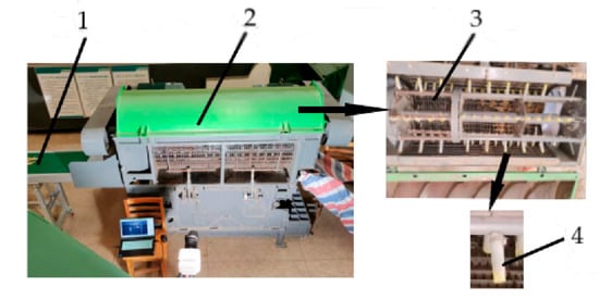 Flexible threshing experiment device. 1. Feeding device 2. Threshing device 3. Threshing cylinder 4. Flexible threshing teeth.