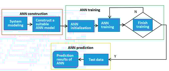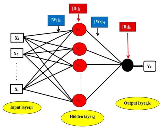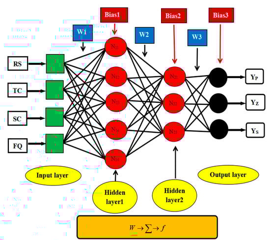 One of the most commonly used neural network models is the BP neural network, which utilizes the BP algorithm. Even the most complex nonlinear relationship completely approximates it. The information is dispersed and stored in the neurons of the network. The computation is extremely fast due to parallel processing. Since neural networks are self-learning and adaptive, they can deal with uncertain or unknown systems. This system is excellent when simultaneously processing both quantitative and qualitative information. It can coordinate a wide range of input information relations and is, thus, ideal for fusion and multimedia applications. A well-trained artificial neural network can function as a predictive model for a specific application, which is a data processing system inspired by biological neural systems. The predictive power of an ANN is derived from training on experimental data, which is then validated using independent data. Artificial neural networks can relearn and adapt to improve their performance by updating data availability [27]. The structure and operation of ANNs have been described by numerous authors [28]. The modeling used in feedforward neural networks for prediction was designed to capture the correlation between the historical model inputs and their corresponding outputs. This is accomplished by repeatedly feeding the model examples of input/output relationships and adjusting the model coefficients (i.e., connection weights) to minimize the error function between the historical output and the model-predicted outputs.
