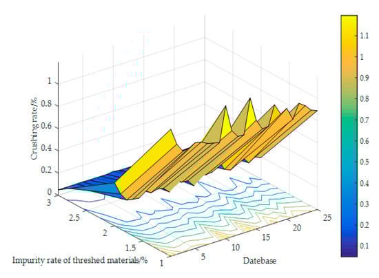 A thorough comprehension of the determinants of threshing performance is required to obtain accurate threshing performance prediction. The rotational speed of the cylinder is closely associated with the performance of the thresher because high-speed results in cracking of the grain, and low-speed leads to unthreshed grain. Moreover, the threshing clearance and separating clearance of the concave sieve significantly influence the threshing performance. Furthermore, the size of the feeding quantity is closely correlated to the threshing characteristics [30].