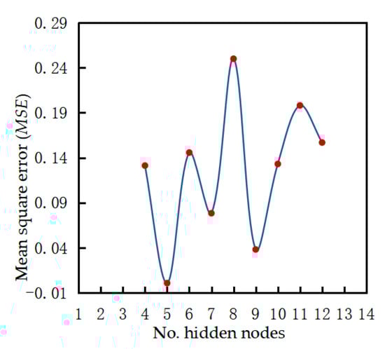 where represents the number of neurons in the hidden layer, denotes the number of neurons in the input layer, is the number of neurons in the output layer, is the constant, and . According to this formula, the value range of the hidden layer nodes of the network was 4–12, and the performance of the artificial neural network under different numbers of nodes is shown in Figure 7. When the number of hidden layers was 5, the minimum was 0.00080796, indicating superior model performance.