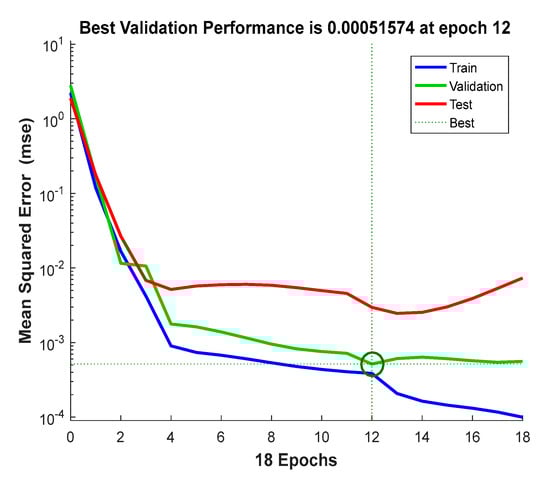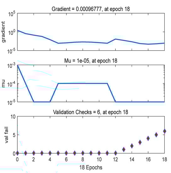 Based on the data shown in Figure 8, the error curves of the model training sample, the corrected sample, and the test sample were well correlated. The curve trend slowly decreased, indicating that the network was trained on the training data. To avoid overfitting with the validation data, the between the initial fitting and validation will become smaller and smaller, but as the network begins to overfit the training data, the will become larger. In the default setting, the training ends when the validation error is added six consecutive times, and the best performance is obtained from the lowest validation error period (drawing circle). Finally, the obtained best artificial neural network parameters are shown in Table 6. Figure 9 shows the training state of the model training phase.
