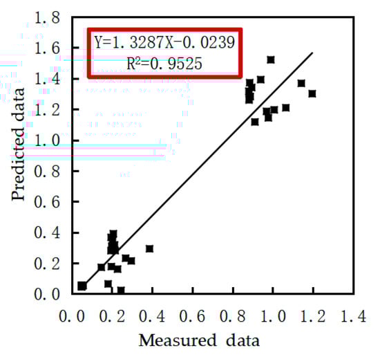 Table 5 summarizes the predictive performance of the optimal neural network. The findings showed a validation set of , of 0.138, and of 0.153. The ANN model with a 4-5-3-3 structure performed effectively. Table 5 further shows the results of the model, which were generally consistent with those obtained during training and testing, indicating that the model can generalize within the range of data used for training.