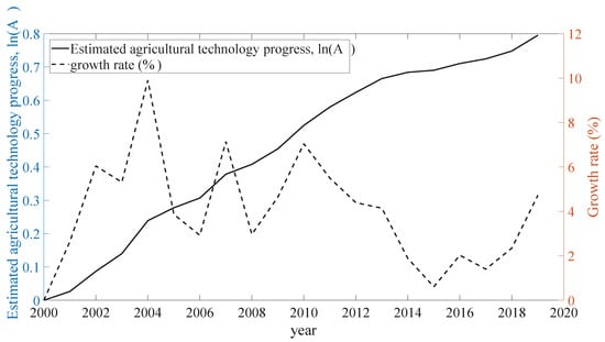 | Evaluated Agricultural Technology Progress | logarithm, , measured in Equation (8) | |