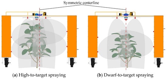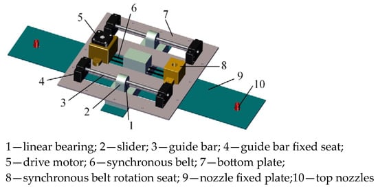 In order to achieve functions of droplets moving from the outside to the inside and from top to bottom as well as the autonomous marching of the sprayer, the targeted and variable sprayer designed in this manuscript is mainly composed of a targeted and variable spray system, autonomous marching system, and vehicle part. The machine’s overall structure is in a “∏” shape, as shown in Figure 1. The vehicle part of the frame is mainly built with aluminium profiles, which ensure high strength while being easy to adjust, lightweight and low price.