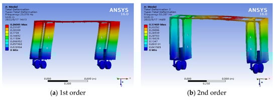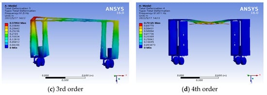 The resonance phenomena may cause damage to components. In order to avoid it, a modal analysis approach is used to obtain the modal parameters of the vehicle body [12,13,14,15,16]. It is because there is a high probability of resonance occurring when the inherent frequency of the vehicle body is close to the frequency of an external vibration source, which can increase the amplitude of the vehicle body [17].
