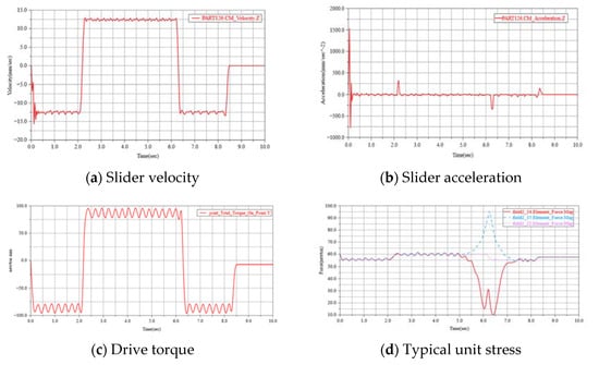 After obtaining the slider motion law, the driving torque of the synchronous belt part is obtained in Figure 5c, which requires a maximum driving torque of about 90 N·mm, while the maximum torque of the drive motor is 420 N·mm, which meets the requirements. As shown in Figure 5d, the field2_14 is the force at the meshing position between the synchronous belt and the front end of the slider, the field2_15 is the force at another meshing position between the synchronous belt and the slider, and the field2_22 is the force on the synchronous belt itself. The typical unit stress on the synchronous belt is different at different positions during the reciprocating movement of the slider. The unit stress at the location where the synchronous belt is in direct contact with the pulley is the largest (the diagram only distinguishes between positive and negative directions), up to about 100 N, but this is much less than the permissible tension of the synchronous belt, 245 N.