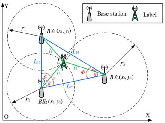 However, these angles will change as the label moves. Especially when the label is outside the triangle formed by the base stations, the angle changes become more significant. However, due to the constraint of relative relationships, the formula for the positions of the label remains the same. The position coordinates of the label can be obtained directly from the UWB module by outputting the above principle, and the process of obtaining them is as follows: The coordinates of the three base stations are known as , , and the coordinates of the labels are , which gives: