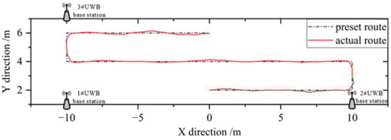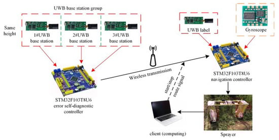 The autonomous marching system of the sprayer is shown in Figure 7. The system’s accuracy is affected by the layout error of the UWB base station and the fluctuation of the position of the UWB label during the movement. Therefore, post-correction processing is used for error correction [24], and the marching route of the sprayer will be transmitted to the client in real-time.