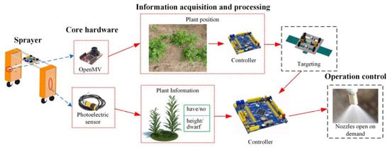 The spraying process is shown in Figure 8. In the first step, the OpenMV module detects the plant position information and controls the top nozzle’s targeting. Then, the photoelectric sensor feeds the plant information, and the controller controls the nozzles for variable spray.