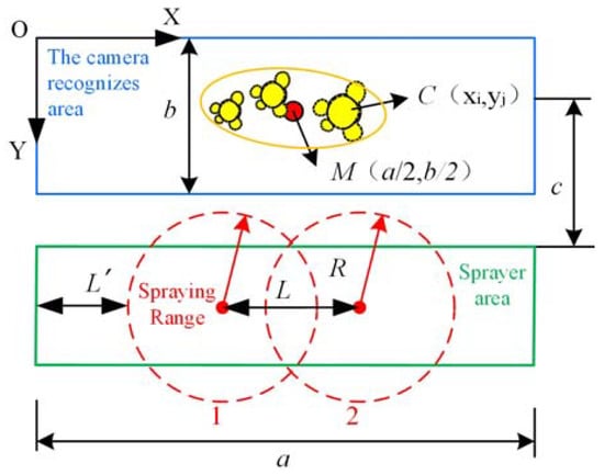 As shown in Figure 9, each component has a reaction time in actual operation, so the camera is extended a distance c to balance the reaction time. In order to simplify the analysis model, the distance between the camera recognition area and the sprayer area in the Y direction is ignored. The upper left corner of the image identified by the camera is used as the origin to establish the coordinate system, and 1 and 2 correspond to the spraying range of the two top nozzles, respectively. The coordinates of the centre of mass of the leaf in the nozzle coordinate system are obtained: