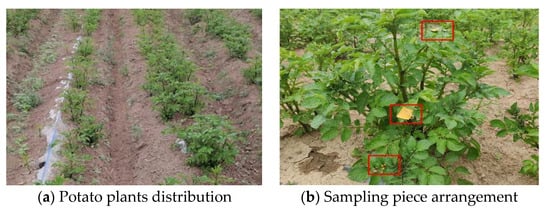 As shown in Figure 11a, there is some positional deviation among the potato plants on the same ridge, and the potato seedlings in adjacent ridges also differ. As shown in Figure 11b, sampling points were arranged on the highest point, 3/4 height, and 1/4 height of the leaves of 10 potato seedlings (the red box in the figure indicates the location of the fog drop test card). A fog droplet test card (30 × 40 mm) was used as the sampling sheet, with one sampling sheet placed on the leaf surface and one on the leaf back at each sampling point. A dye (Rhodamine-B) was added to water as the spray liquid (the concentration is about 0.2%), and the amount of spray liquid used was recorded after the test was completed and the fog droplets were dried (the principle is similar to that of water sensitive paper, the fog droplets will appear blue). Each group was repeated three times, and the average value was taken. A control group was set up in this experiment, which used the continuous spray method (using the same sprayer, but with all nozzles continuously open and without targeted and variable spray), with the same arrangement as the experimental group.