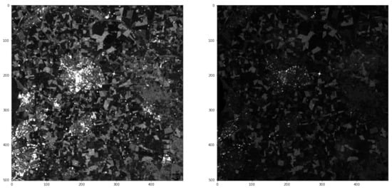 Typical level-1 SAR backscatter, VH (left), and VV polarization (right), with orthorectification and radiometric calibration.