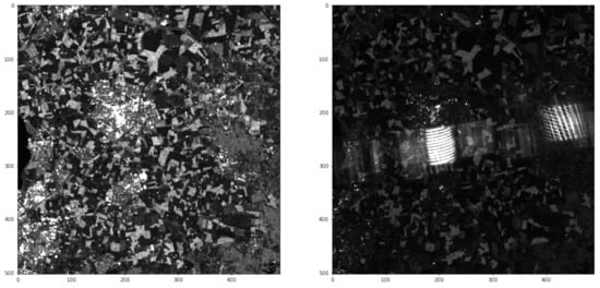 An example of Sentinel-1 data altered by RFI. VV band (left) is not influenced. VV band (right), however, is heavily affected by RFI.