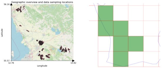 A geographical overview of the data. The left figure shows the locations of the fields in southwest Sweden. The figure to the right shows the same region where the green tiles represent the regions/patches of Sentinel-1 data downloaded. These patches were selected in order to cover all the fields.