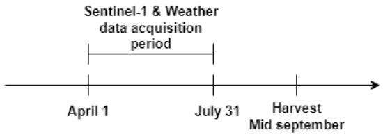The Sentinel-1 and weather data were collected from the first of April until the end of July. This end date is approximately a month before harvest, which for winter wheat typically occurs in mid-September in Sweden. In general, however, we only retained a single contribution per week from each of our three input data sources (Sentinel-1, weather, or topography). For Sentinel-1, this was performed by selecting the first RFI-free image from that week. For weather, the daily measurements were accumulated over the whole week.
