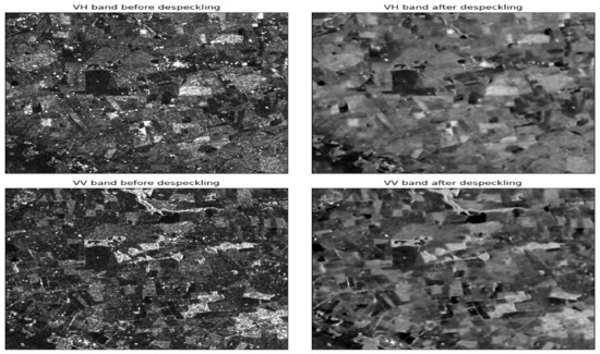 Images for VV and VH polarizations before and after applying the transformation and despeckling. The process may have caused some loss of sharpness, but it is generally a significant improvement compared to more traditional speckle filtering techniques [