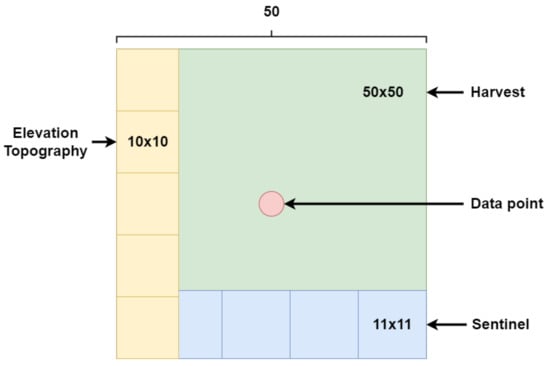 Visualization of the mismatch in resolution between the yield, Sentinel-1, topography, and elevation data. The lowest resolution was given by the yield data, where each data point summarizes yield within a 50 × 50 area. The satellite data had a finer resolution of 11 × 11 , while the topography and elevation data shared a resolution of 10 × 10 . This resolution difference was the reason for introducing grid sampling instead of just sampling the nearest data point in space.