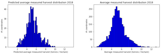 The predicted yield distribution for 2018 (left), obtained using an LGBM model with grid G-50 and input “All features”, closely matched the true yield distribution (right). The model accurately captured the shape, mean, and variance of the true distribution for this year.