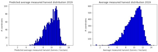 The predicted yield distribution for 2019 (left), obtained using an LGBM model with grid G-50 and input “All features”, closely matched the true yield distribution (right). The model accurately captured the shape, mean, and variance of the true distribution for this year.
