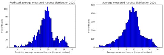 The predicted yield distribution for 2020 (left), obtained using an LGBM model with grid G-50 and input “All features”, closely matched the true yield distribution (right). The model accurately captured the shape, mean, and variance of the true distribution for this year.