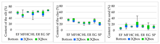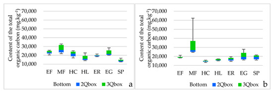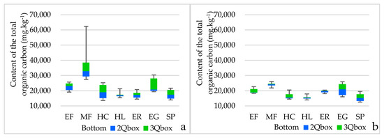 With regard to SOM, the tillage system affects the textural composition, which is one of the factors that characterises the transformation of organic substances. Overall, tillage did not influence soils with a lower proportion of silt (MF < HL < EG) (Figure 1). On the other hand, statistically significant differences in TOC (Figure 2) were observed in soils with a higher proportion of silt (SP > ER > HC > EF) (Figure 1), which bound a significant amount of carbon [49]. Soil texture is one of the parameters [50] that influences quantity and quality.