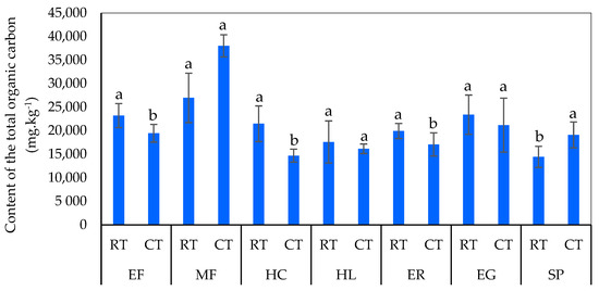 Differences in total organic carbon in the soils. EF: Eutric Fluvisol; MF: Mollic Fluvisol; HC: Haplic Chernozem; HL: Haplic Luvisol; ER: Eutric Regosol; EG: Eutric Gleysol; SP: Stagnic Planosol; RT: reduced tillage; CT: conventional tillage. The different letters (a and b) represent statistically significant differences (p < 0.05) based on the LSD test.