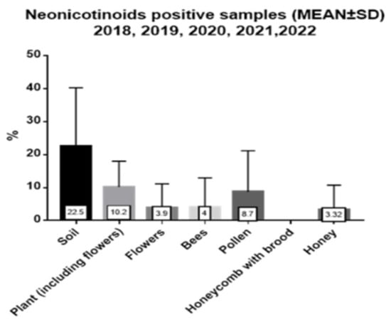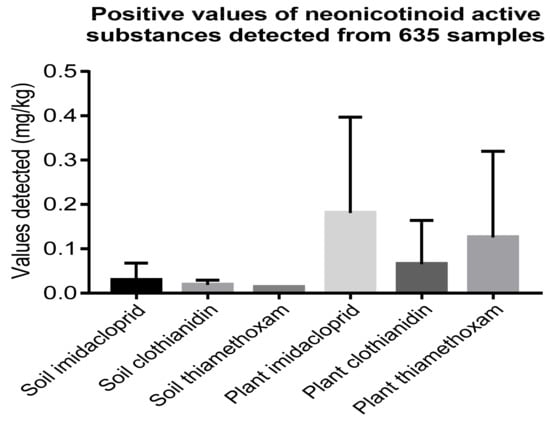 Among the analyzed soil samples, only 25.3% had neonicotinoid residues above the limit of quantification. From the plant samples, 11.94% had residues above the LOQ. From the flower samples, no more 3.12% had residues that exceeded the limit of quantification. Regarding bee samples, 1.65% had neonicotinoid residues above the LOQ, at 16.66%. Of the pollen samples, the residues exceeded the limit of quantification. In samples of honeycomb with brood and honey samples, no residues of any of the three substances were identified.