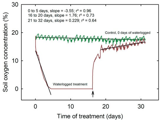 Soil oxygen concentration across waterlogging and control treatments during the experimental period of 32 days. The arrow indicates the day that waterlogging treatment was stopped, and the recovery period started.